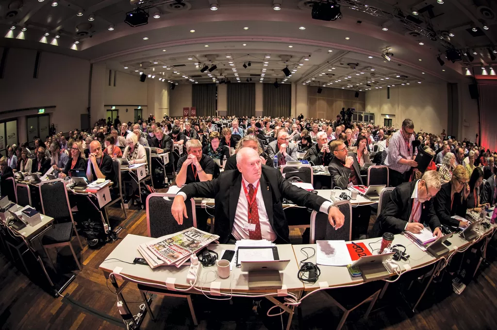 LOs Kongress i 2013. Høy temperatur under kongressens debatt om LOs framtidige organisasjon. På Kongressen er alle LOs forbund representert. Foran sitter daværende LO-leder Roar Flåthen. Foto: Kristian Brustad. |